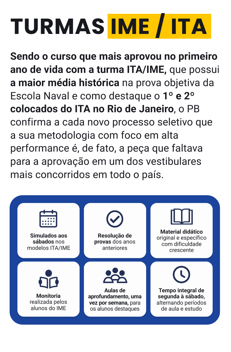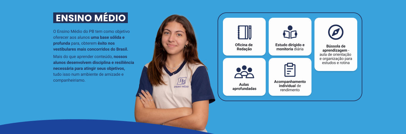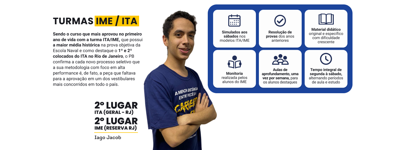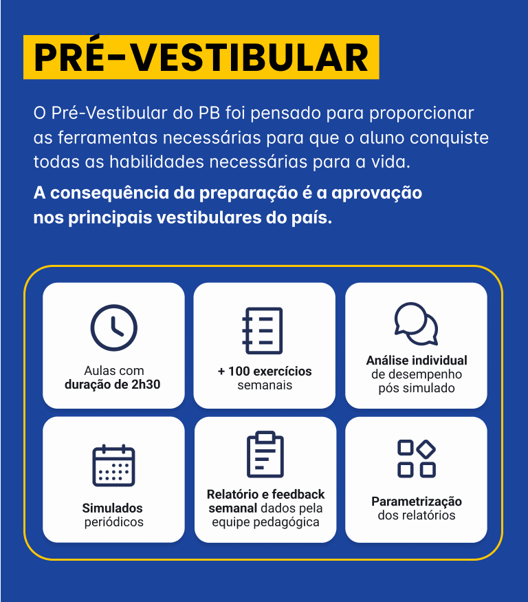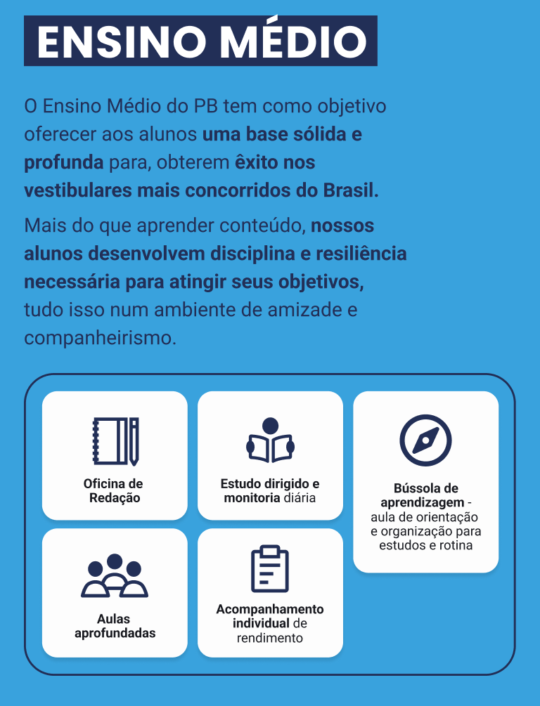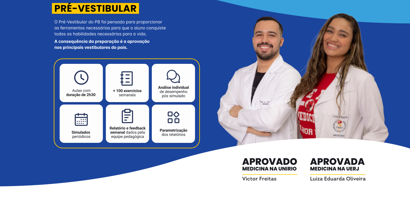 Com uma década de reconhecimento e resultados, o PB vem desempenhando um papel ativo no futuro profissional de muitos alunos, pois, com grande índice de aprovação, tem possibilitado o ingresso nos melhores cursos, das melhores universidades de todo o Brasil, com destaque aos cursos de Medicina. Hoje, você encontra a metodologia vencedora do PB em três unidades, Icaraí e Região Oceânica, em Niterói, e Tijuca, no Rio, além da modalidade on-line. No estado do Rio de Janeiro, somos líderes em aprovação com destaque em medicina! Na unidade Tijuca, além do Pré-Vestibular para o ENEM, também oferecemos o Preparatório Militar com foco nos maiores concursos militares do Brasil. É a nossa metodologia de aprovação sendo aplicada em mais um segmento de alta performance: aprovação para a carreira militar!